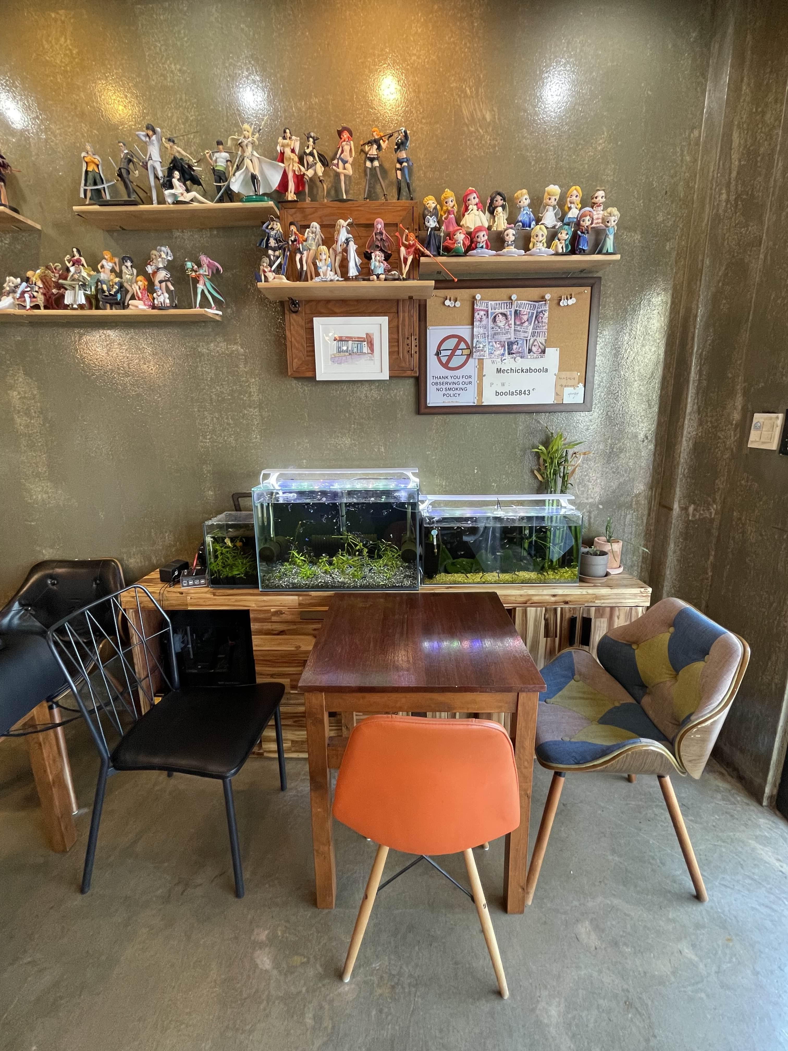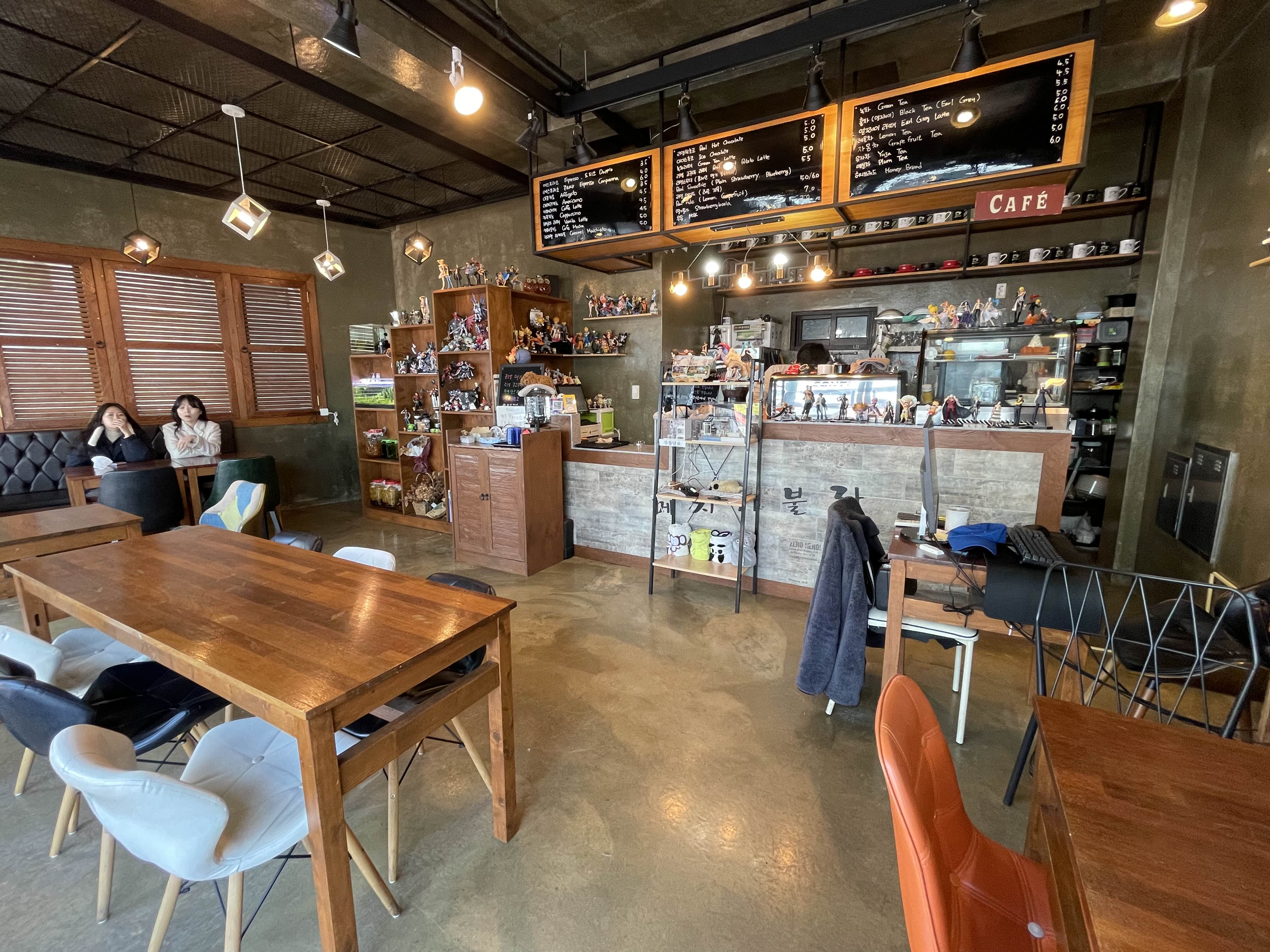카페 들어서자마자 이건... 뭐지? 너무 놀랐음... 덕후의 성지인가? 이 많은 피규어들을 다 뽑기로 뽑았다고. 주인장께서 직접 4개월 동안 뽑았고 더 이상 둘 데가 없어 뽑기에서 하산하셨다고 한다. 피규어들 가격으로 치면 약 1600만 원-2000만 원 정도라고 한다.