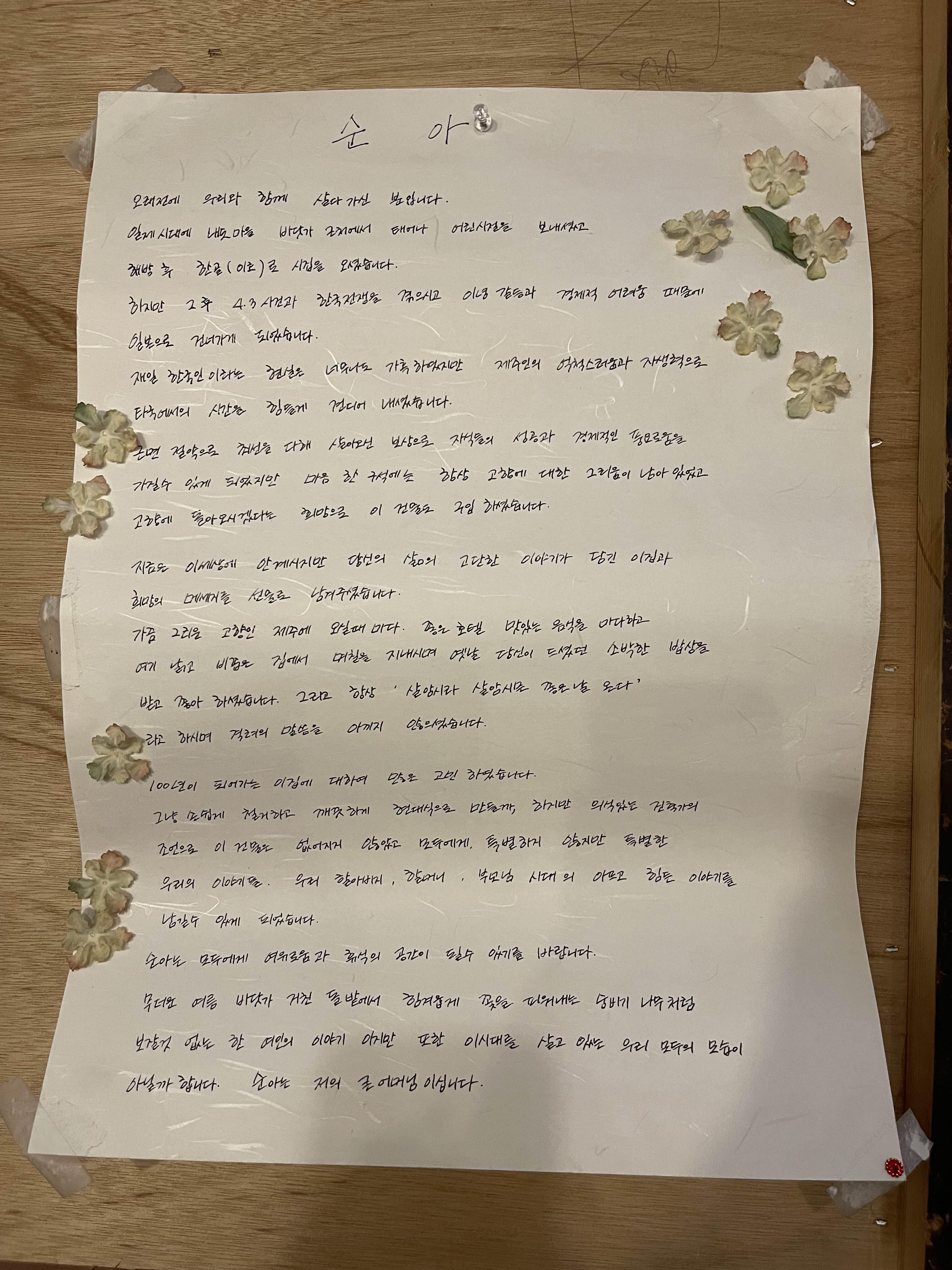 공간이 될 수 있기를 바랍니다. 무더운 여름 바닷가 거친 돌밭에서 힘겹게 꽃을 피워내는 숨비기 나무처럼 보잘것없는 한 여인의 이야기이지만 또한 이 시대를 살고 있는 우리 모두의 모습이 아닐까 합니다. 순아는 저의 큰어머님이십니다.